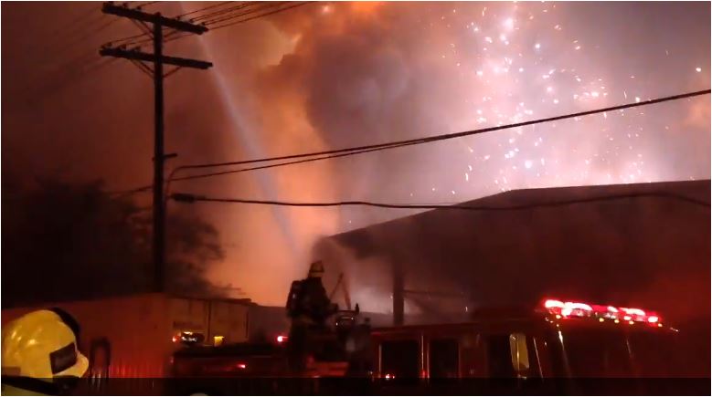 County Fire Chief Daryl Osby said arriving crews found flames shooting through the roofs of two structures, one of which was a metal-recycling plant. Crews began pouring water on the flames, but the oxygen from the water created a chemical reaction with the burning magnesium, one of the metals being stored at the facility and awaiting recycling, producing what one fire official described as “fireballs” and setting off strong explosions.